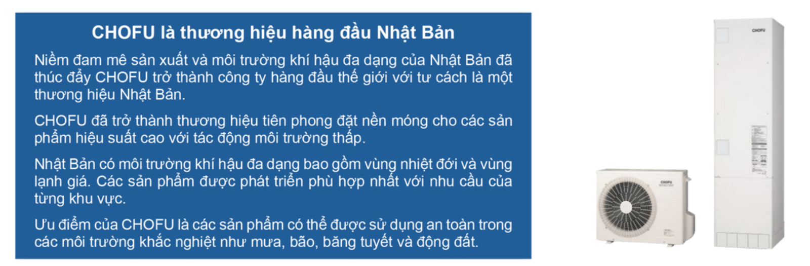 Trong bối cảnh chi phí năng lượng ngày càng tăng cao, nhu cầu sử dụng nước nóng liên tục trong sinh hoạt gia đình, đặc biệt tại các đô thị lớn, biệt thự, chung cư cao cấp và khách sạn, đang đặt ra yêu cầu khắt khe hơn về một giải pháp vừa tiết kiệm điện, vừa an toàn cho sức khỏe và bền vững với môi trường. Đó cũng chính là lý do dòng máy nước nóng bơm nhiệt CHOFU Ecocute thế hệ thứ 5 ra đời – một bước tiến vượt trội của công nghệ Nhật Bản trong lĩnh vực nước nóng trung tâm.