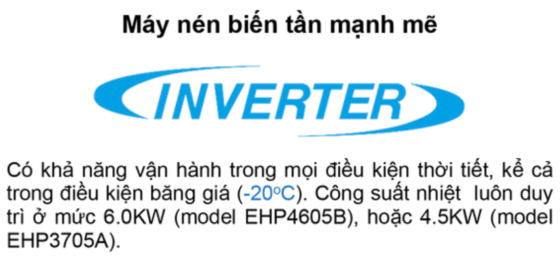Máy nước nóng bơm nhiệt CHOFU Ecocute sử dụng công nghệ Inverter tiên tiến, cho phép thiết bị vận hành ổn định ngay cả trong điều kiện thời tiết khắc nghiệt, kể cả khi nhiệt độ môi trường xuống tới -20°C. Nhờ khả năng duy trì công suất nhiệt ổn định, hệ thống luôn đảm bảo nguồn nước nóng liên tục mà vẫn tiết kiệm điện năng tối ưu.