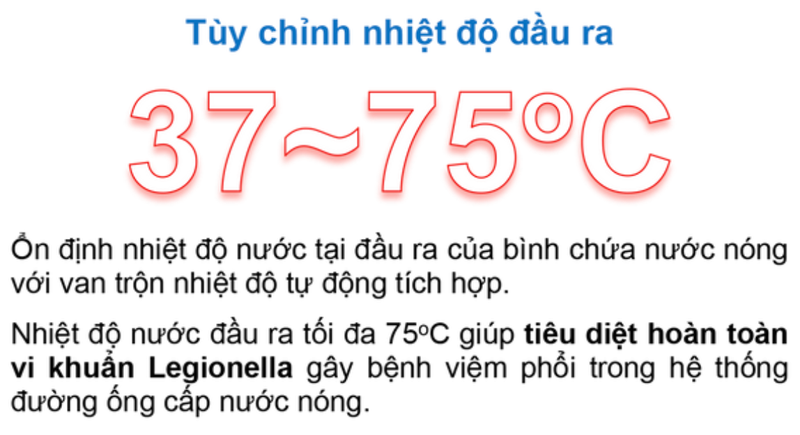 Hệ thống cho phép điều chỉnh nhiệt độ đầu ra linh hoạt, phù hợp với nhiều nhu cầu sử dụng khác nhau như tắm, sinh hoạt, spa hay khách sạn. Ở mức nhiệt cao, hệ thống còn giúp tiêu diệt vi khuẩn trong đường ống cấp nước nóng, đảm bảo nước luôn sạch và an toàn khi sử dụng.