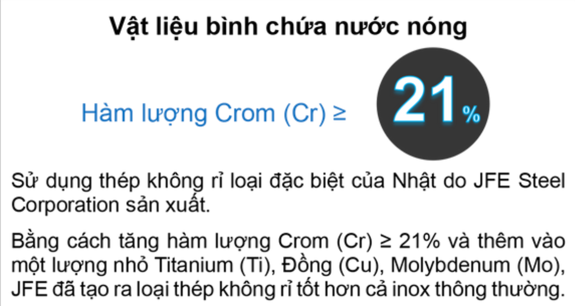 Bình chứa nước nóng của CHOFU Ecocute được chế tạo từ thép không gỉ đặc biệt của Nhật Bản, có hàm lượng Crom (Cr) ≥ 21%, kết hợp cùng Titanium, Đồng và Molybdenum. Cấu trúc vật liệu này giúp tăng khả năng chống ăn mòn, kéo dài tuổi thọ thiết bị và đảm bảo chất lượng nước nóng ổn định trong suốt quá trình sử dụng.